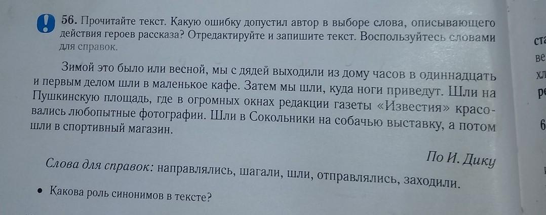 56. Прочитайте текст. Какую ошибку допустил автор в выборе слова, описывающего действия героев рассказа? Отредактируйте и запишите текст. Воспользуйтесь словами Для справок. Зимой это было или весной, мы с дядей выходили из дому часов в одиннадцать и первым делом шли в маленькое кафе. Затем мы шли, куда ноги приведут. Шли на Пушкинскую площадь, где в огромных окнах редакции газеты «Известия» красо- вались любопытные фотографии. Шли в Сокольники на собачью выставку, а потом шли в спортивный магазин. По И. Дику Слова для справок: направлялись, шагали, шли, отправлялись, заходили. • Какова роль синонимов в тексте?