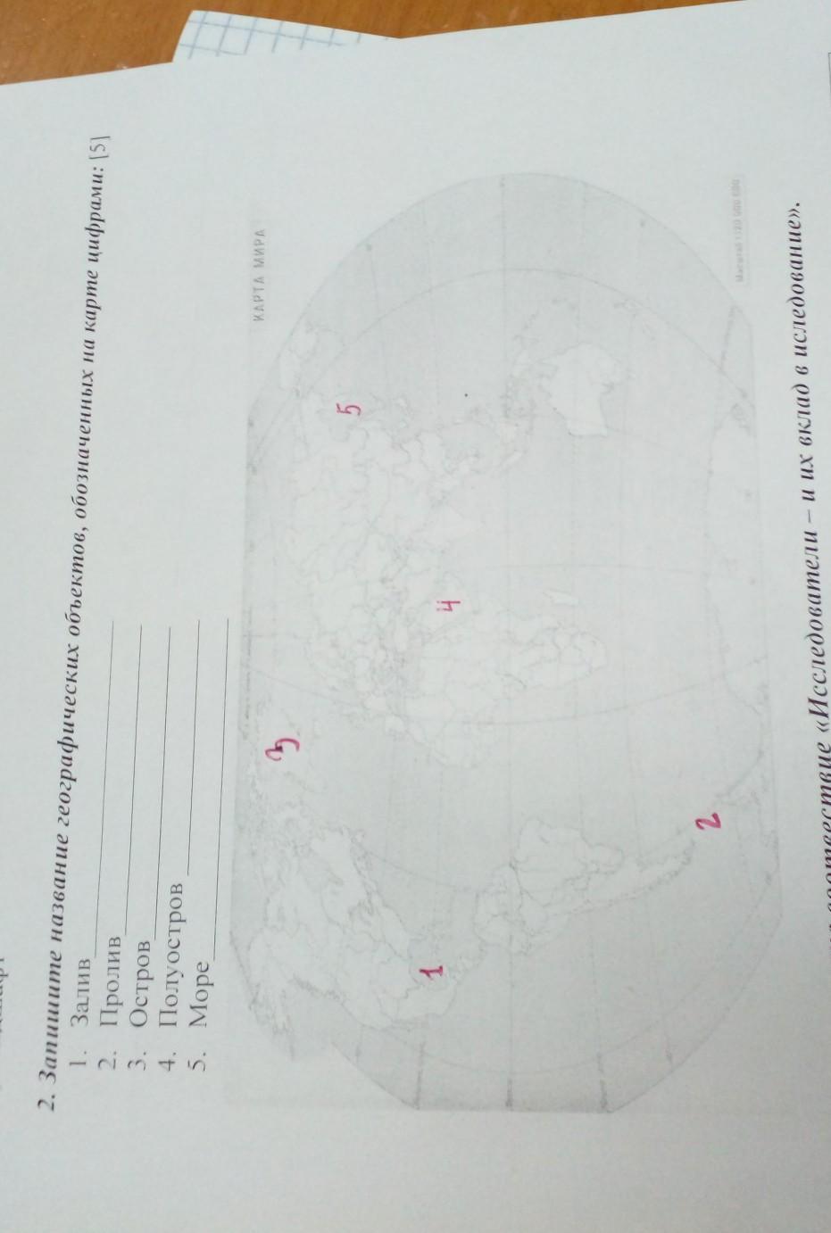 запишите название географических объектов,обозначеных на карте 1.Залив 2.Пролив 3.Остров 4.полуостров 5.море