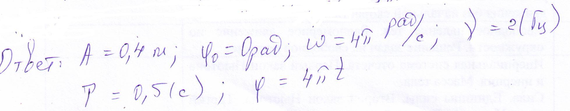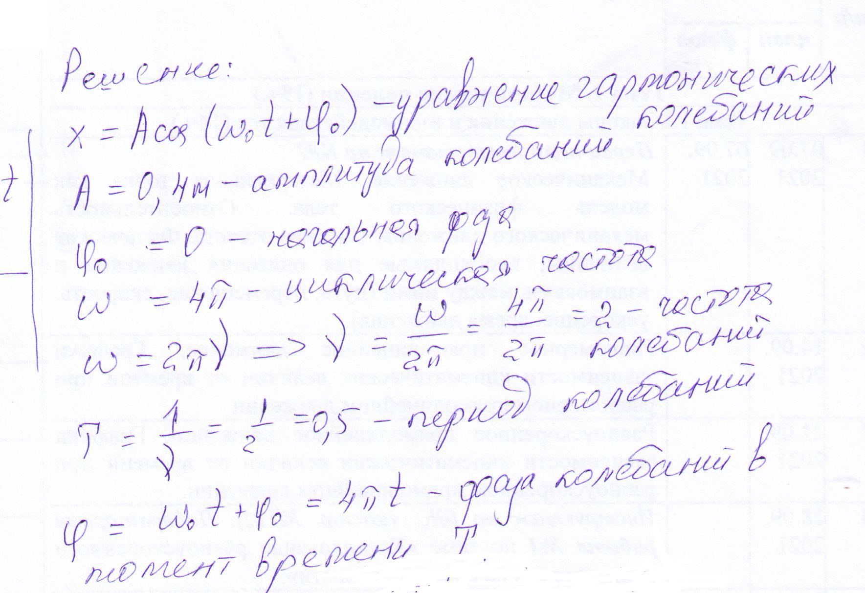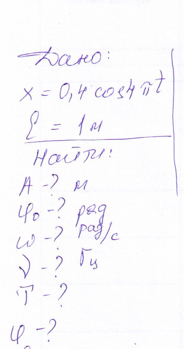 Дано уравнение зависимости координаты от времени для математического маятника: x=0,4cos4пt. Длина подвеса маятника 1м. Установите как можно больше физических величин, характеризующих это колебание.