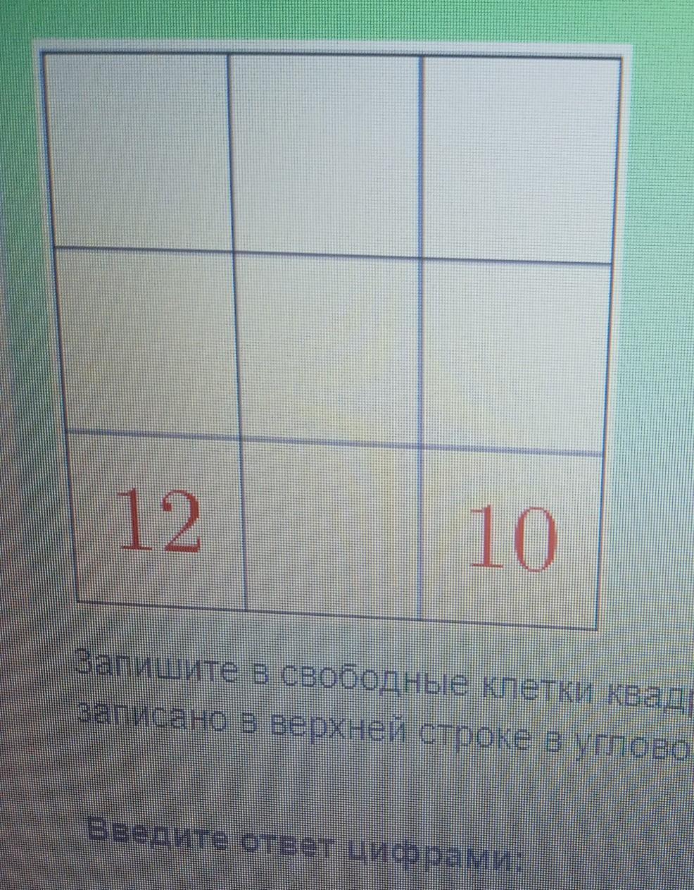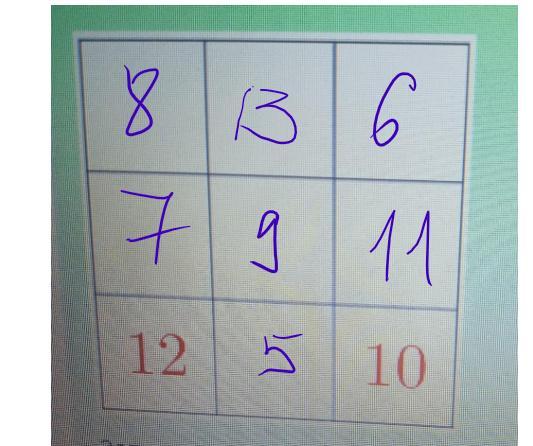 Запишите в свободные клетки квадрата числа 5, 6, 7, 8, 9, 11, 13 так, чтобы сумма чисел во всех строках столбцах и на 2 диагоналях были равны .Какое число будет в верхней строке в угловой клетке справа?