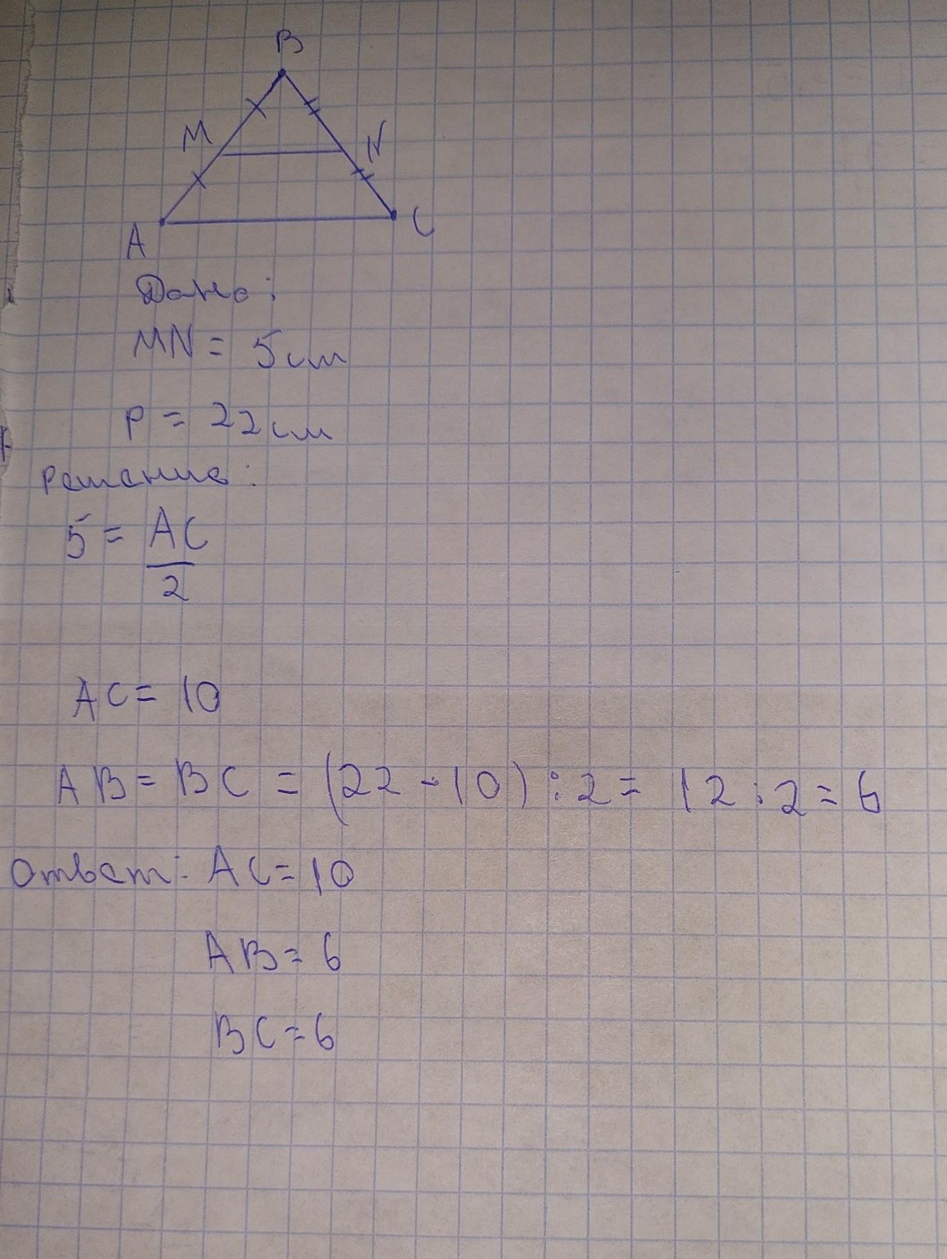 5. 4 балла) Средняя линия равнобедренного треугольника, параллельная Основанию, равна 5 см. Найдите стороны треугольника, если его периметр равен 22 CM