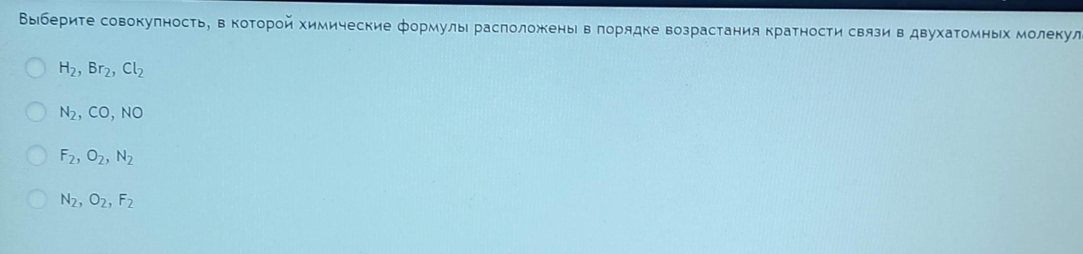 Выберите совокупность, в которой химические формулы расположены в порядке возрастания кратности связи в двухатомных молекулах.