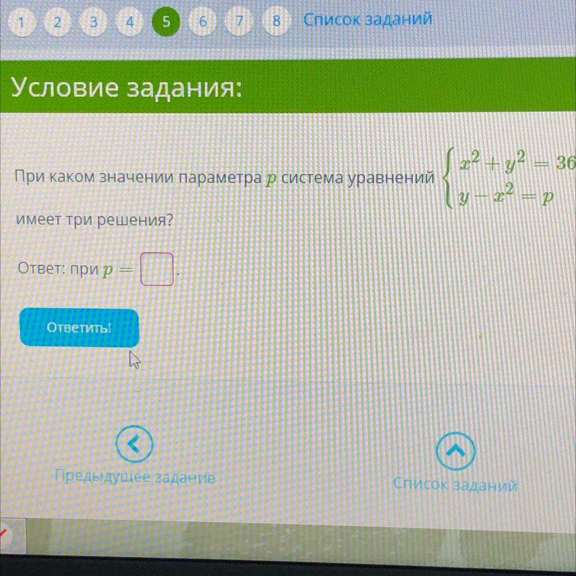 Ответом на этот вопрос является значение параметра p = -6, так как окрудность и парабола пересекаются в 3 точках