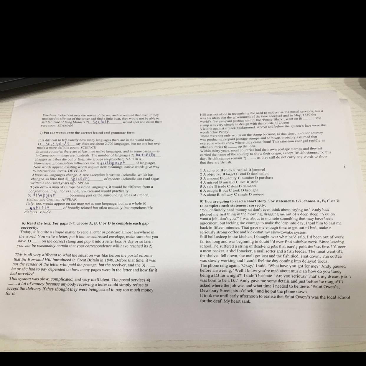 1 - stuck (b); 2 - destination (d); 3 - amount (a); 4 - lost (c); 5 - sale (a); 6 - took (c); 7 - unique (d).