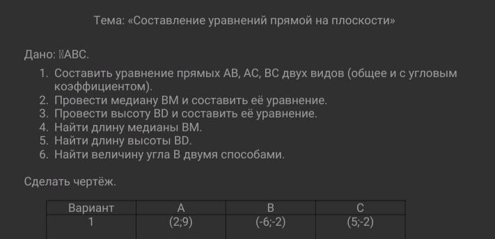б) найти координаты точки Д как точку пересечения прямой АС и высоты ВД, решив систему: