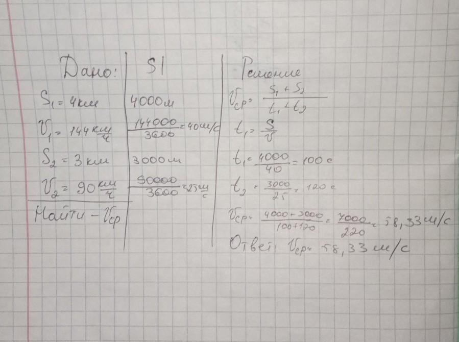 прошу очень Трамвай прошел первые 4 км м со средней скоростью 144 км/ч, следующие 3 км – со скоростью 90 км/ч . Определите среднюю скорость на всем пути?