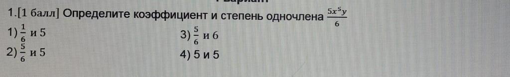 1.[1 балл] Определите коэффициент и степень 1/6 1) H5 2) 5/6 5 3) 5/6 б 4) 5 и 5 4Pi * e * H * a * (5x ^ 5 * y)/6