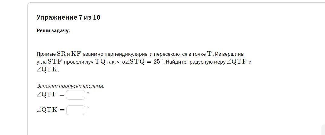 Прямые SR SR и KF KF взаимно перпендикулярны и пересекаются в точке TT . Из вершины угла STFSTF провели луч TQ TQ так, что \angle STQ = 25 \degree∠STQ=25° . Найдите градусную меру \angle QTF∠QTF и \angle QTK∠QTK .