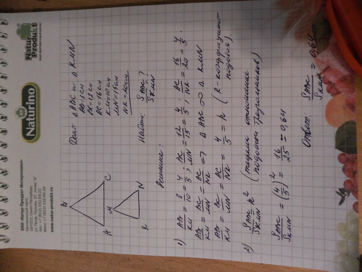 Найдите отношение площадей треугольников АВС и KMN, если АВ = 8 см, ВС = 12 см, АС = 16 см, КМ = 10 см, MN = 15 см, NK = 20 см