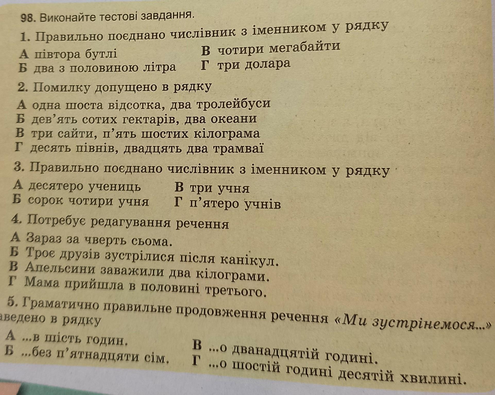 3. Правильно поєднано числівник з іменником у рядку ⇒ Г – п'ятеро учнів (числівник 5 узгоджується з ім. у формі Р.в. мн.)