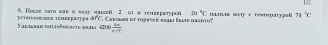 m2 = - m1 (t-t1) / (t-t2) = - 2 кг (40-20) / (40-70) = 4/3 кг = 1,33 кг