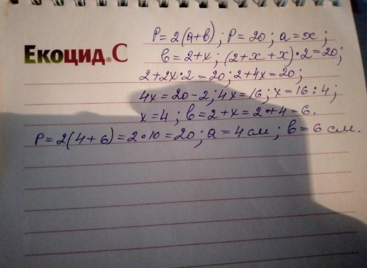 периметр прямокутника дорівнює 20 см . Знайдіть його сторони якщо одна з них на 2см менша за другу