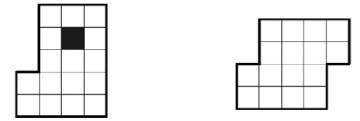 Разрежьте фигуру с вырезанным квадратиком на две одинаковые части, из которых можно составить вторую фигуру. Части разрешается и поворачивать, и переворачивать.