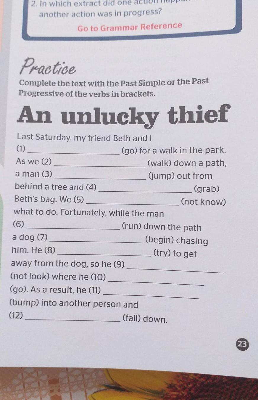 An unlucky thief Last Saturday, my friend Beth and I (1) (go) for a walk in the park. As we (2) (walk) down a path, a man (3) (jump) out from behind a tree and (4) (grab) Beth's bag. We (5). (not know) what to do. Fortunately, while the man (6) (run) down the path a dog (7) (begin) chasing him. He (8) (try) to get away from the dog, so he (9) (not look) where he (10) (go). As a result, he (11) (bump) into another person and (12) (fall) down.