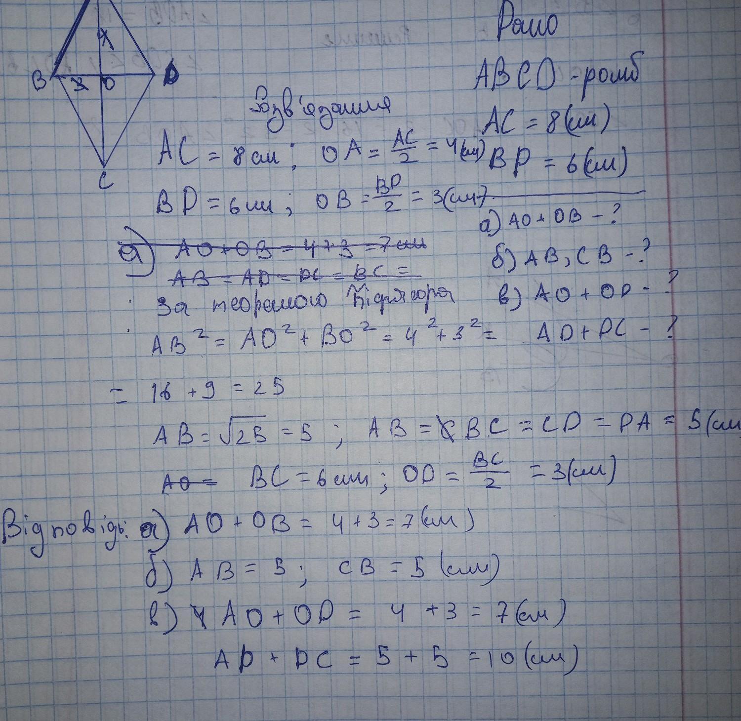 ДАЮ 40 БАЛЛОВ Дан ромб ABCD, его диагонали AC и BD пересекаются в точке О, причём AC=8 см, BD=6 см. Найдите длины следующих векторов: а) АО + ов (8 баллов); б) АВ CB (8 баллов); в) AO + OD — AD + DC (10 баллов). -
