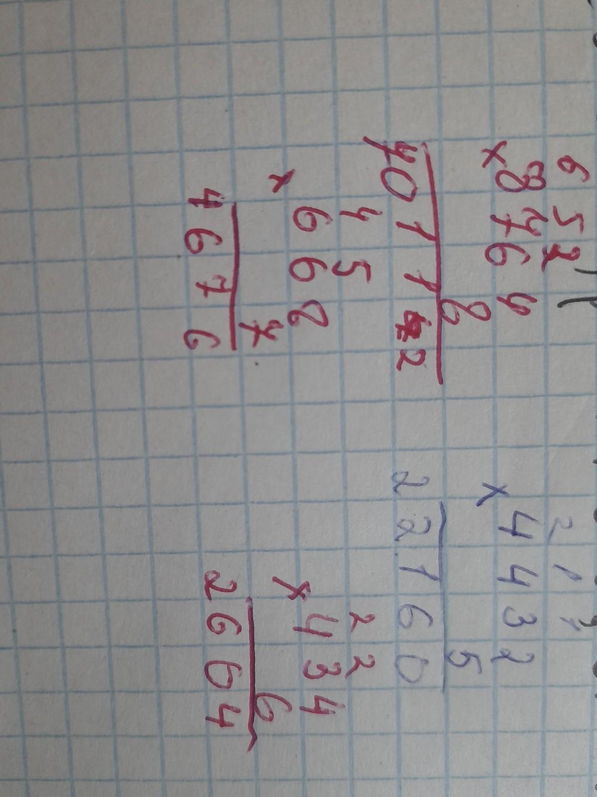 Решите примеры на умножение в столбик и запишите ответ рядом с примерами 5 × 4432 6 × 434 7 × 668 8 × 8764 в