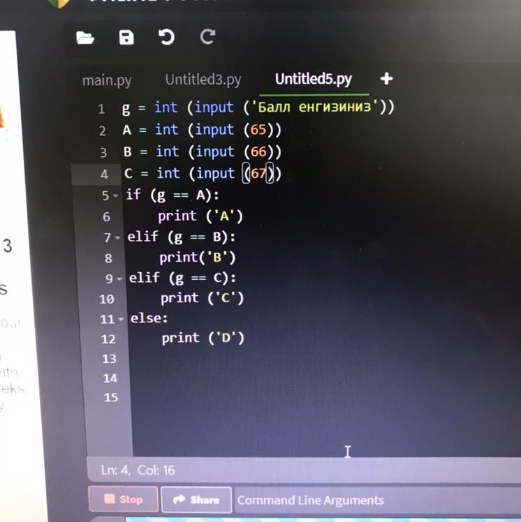 Следует обернуть числа в аргументе метода input() в строку. Как вы можете заметить, в документации python*¹ говорится, что метод (функция) принимает на вход только один аргумент (параметр) - это строка. Вы пытаетесь подставить значение типа int (integer).Соответсвенно, следующие три строки (2, 3, 4) имеют смысл быть в таком виде:A = int(input('65'))B = int(input('66'))C = int(input('67'))Однако, что-то мне подсказывает, что от вас требовалась такая реализация:A = 65B = 66C = 67или же такаяA = int(input())B = int(input())C = int(input())Стоит знать, что метод input() считывает с консоли значение, метод int() преобразовывает значение в тип integer, поэтому в зависимости от того, что вы хотели, используйте следующий вариант, написанный мною выше, а я всего лишь указал на ваши ошибки в коде."Типо пишешь 66 и он должен показать какой букве это цифры находится и да буквы:A=90-100,B=70-89,C=60-69,D=50-59,F=0-49"n = int(input())if 0 <= n <= 49: print('F')elif 50 <= n <= 59: print('D')elif 60 <= n <= 69: print('C')elif 70 <= n <= 89: print('B')elif n <= 100: print('A')