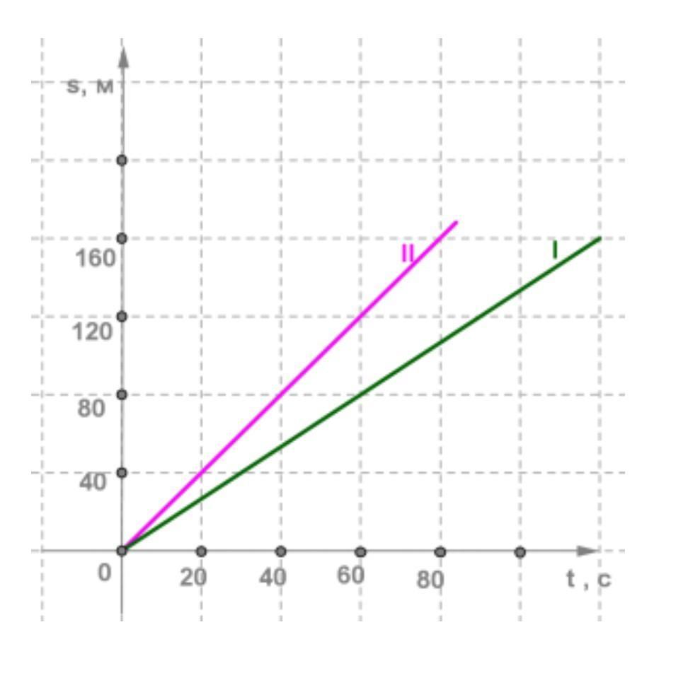 Дан график движения двух тел. Известно, что оба тела движутся равномерно и прямолинейно. Определи скорость каждого тела и сравни скорости движения тел. Какой путь пройдут эти тела за 3 мин. grafik3.png Ответ: (округли до десятых!) скорость I тела — м/с, скорость II тела — м/с, скорость I тела , чем скорость II тела (в окошко напиши знак ''), путь I тела за 3 мин. — м, путь II тела за 3 мин. — м.