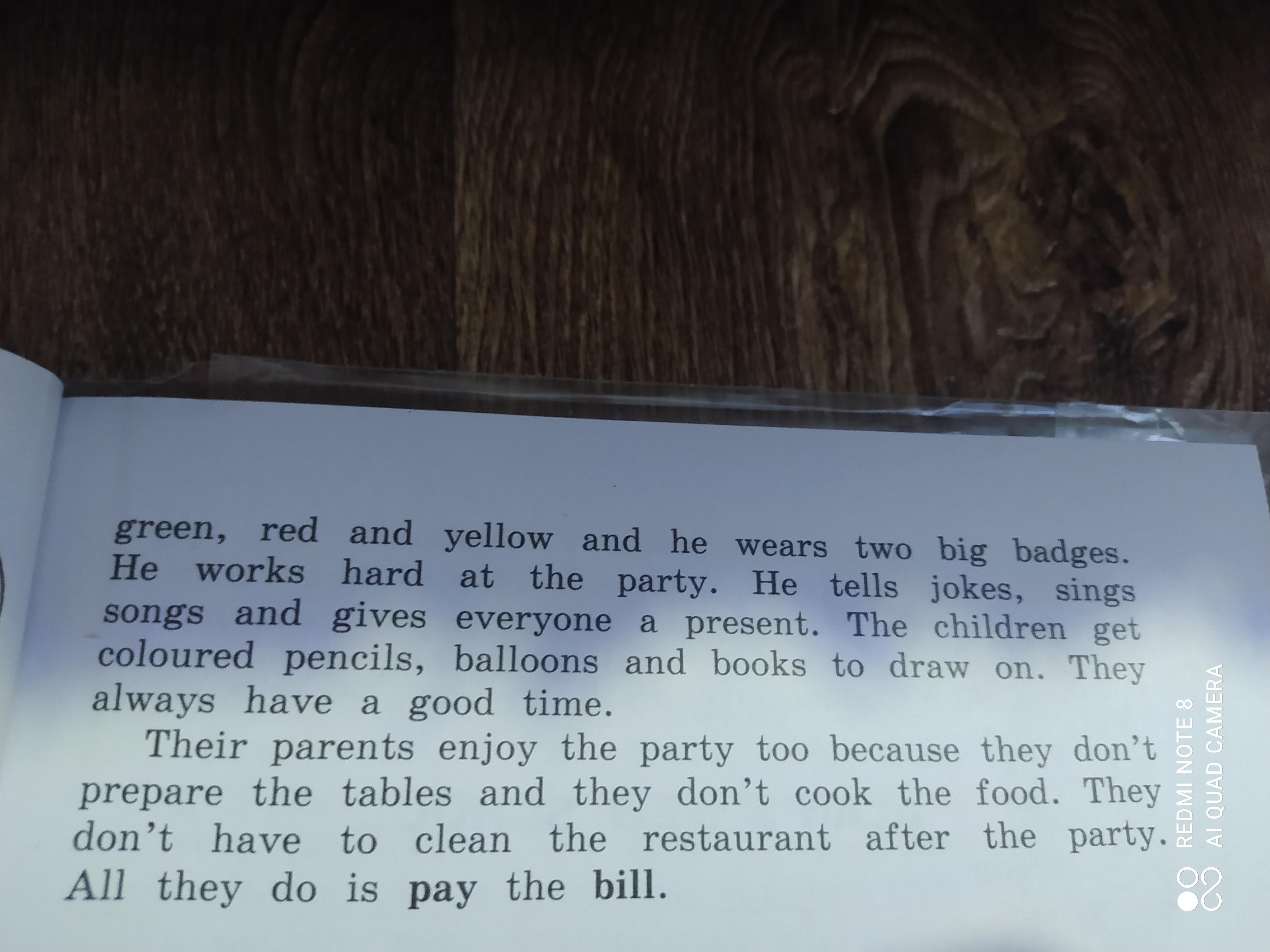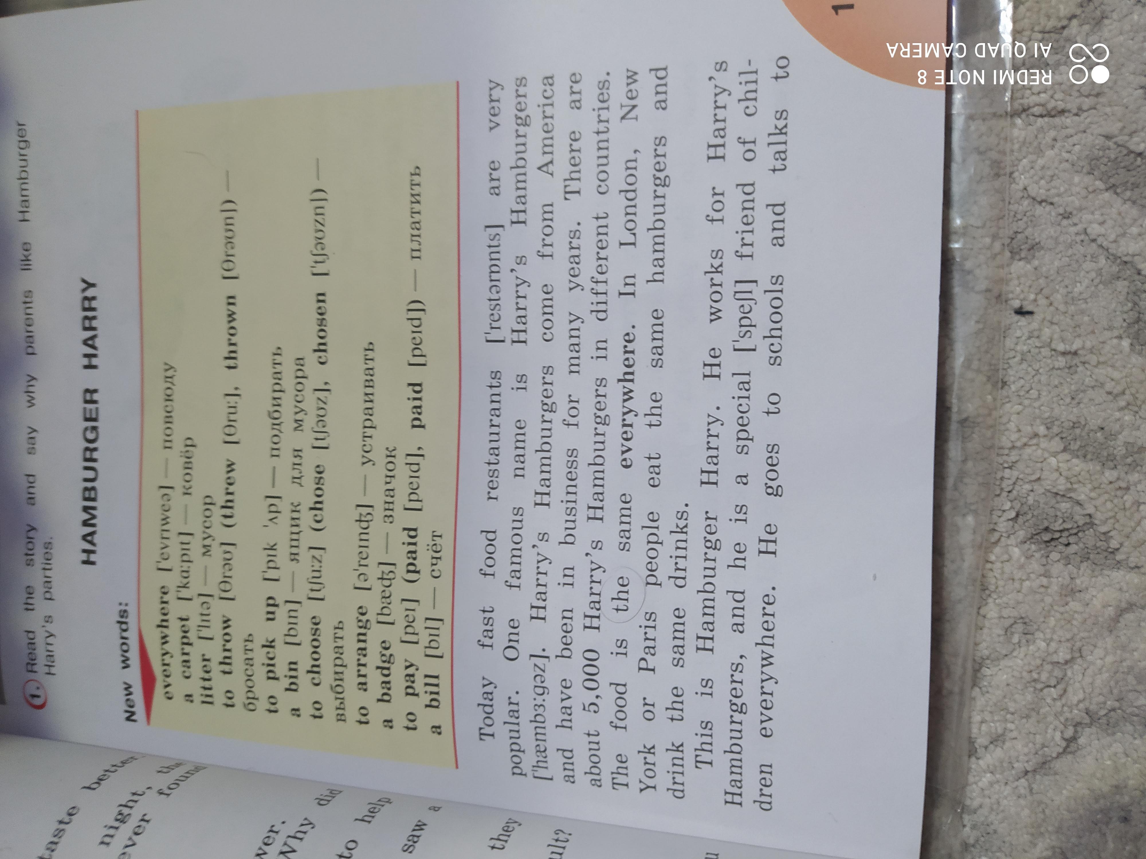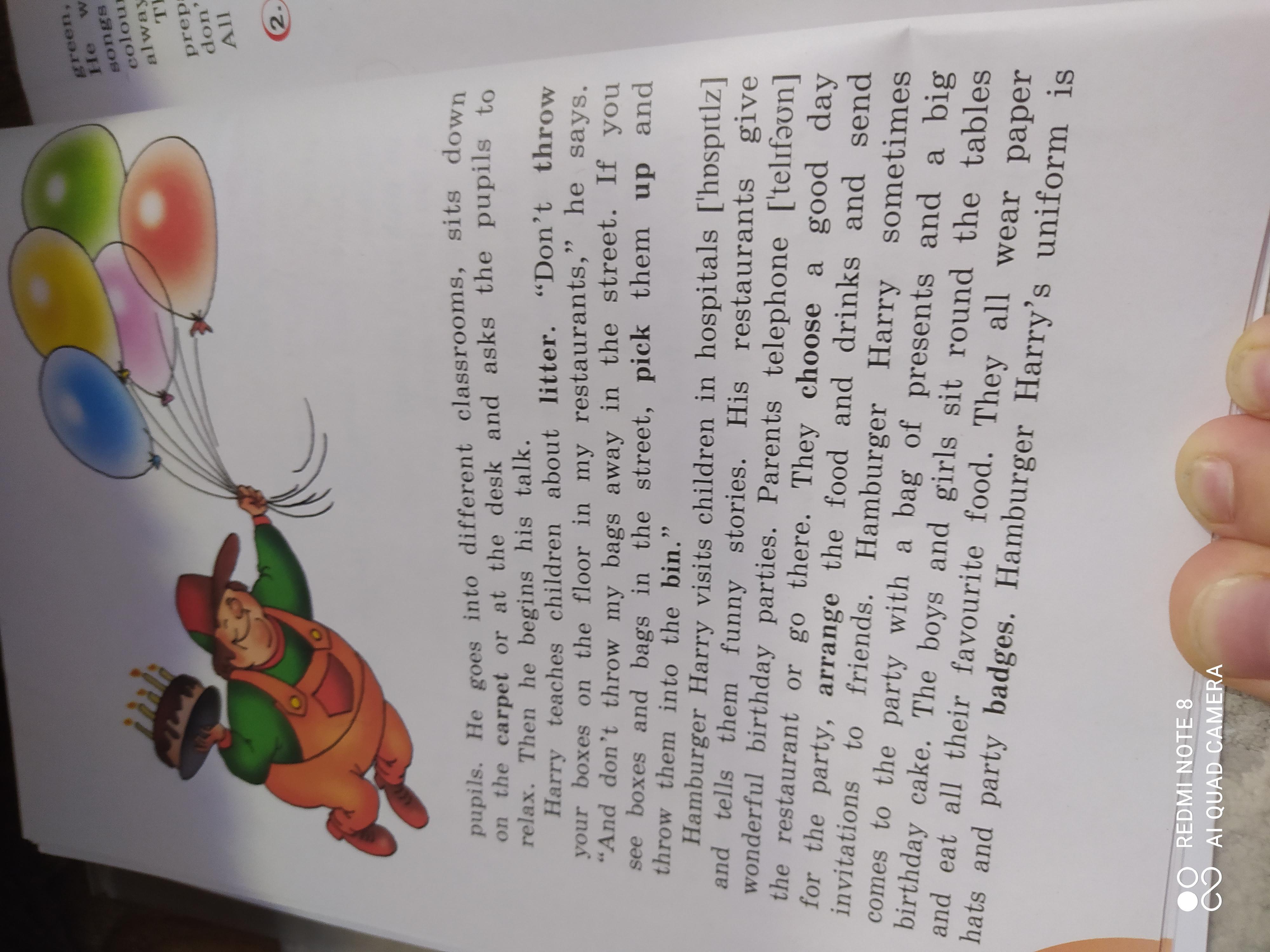 Сегодня фаст фуд рестораны очень популярны. Одно и знаменитых заведений Гарри гамбургер. Оно находится в Америке и были бизнесом в течении многих лет. Есть около 5000 Гарри гамбургеров в разгых странах. Еда одинакова везде- в Лондоне,Нью-Йорке или Париже люди ели эти гамбургеры и пили одинаковые напитки. Это был Гамбургер Гарри. Он работал в Гамбургере Гарри и везде был особенным другом для детей. Он ходил в школы и разговаривал с учениками. Он приходил в классы,садился на пол или за парту и спрашиввл учеников об местах отдыха. Затем он начинал говорить. "Дети не бросают свои коробки на пол у меня в ресторане "- говорил он. И не выбрасывают мои сумки на улице. Если вы видите коробку или сумку на улице то поднимите её и отнесите в мусорку(не знаю как переводится bin). Гамбургер Гарри навещал детей в больницах и рассказывал им смешные истории. Ресторант устраивал вечеринки по случаю день рождения. Родители звонили в ресторан и приходили туда. Они выбирали еду и заказывали напитки для вечеринки. Гамбургер Гарри иногда приходил на вечеринку с большой сумкой подарков и тортом. Девочки и мальчики садились за столы и ели их любимую еду. Они примеряли праздничные шапочки и бэйджики. Форма Гамбургера Гарри была зеленой с жёлтым. Он работал усердно на вечеринке. Он рассказывал анегдоты,пел песни и дарил подарки. Дети брали карандаши для рисования,шарики и книги. Они всегда отлично проводили время. Родители устраивают вечеринки и им не нужно готовить еду. Они не убирают ресторан после вечеринки. Они все всего лишь платят счёт.