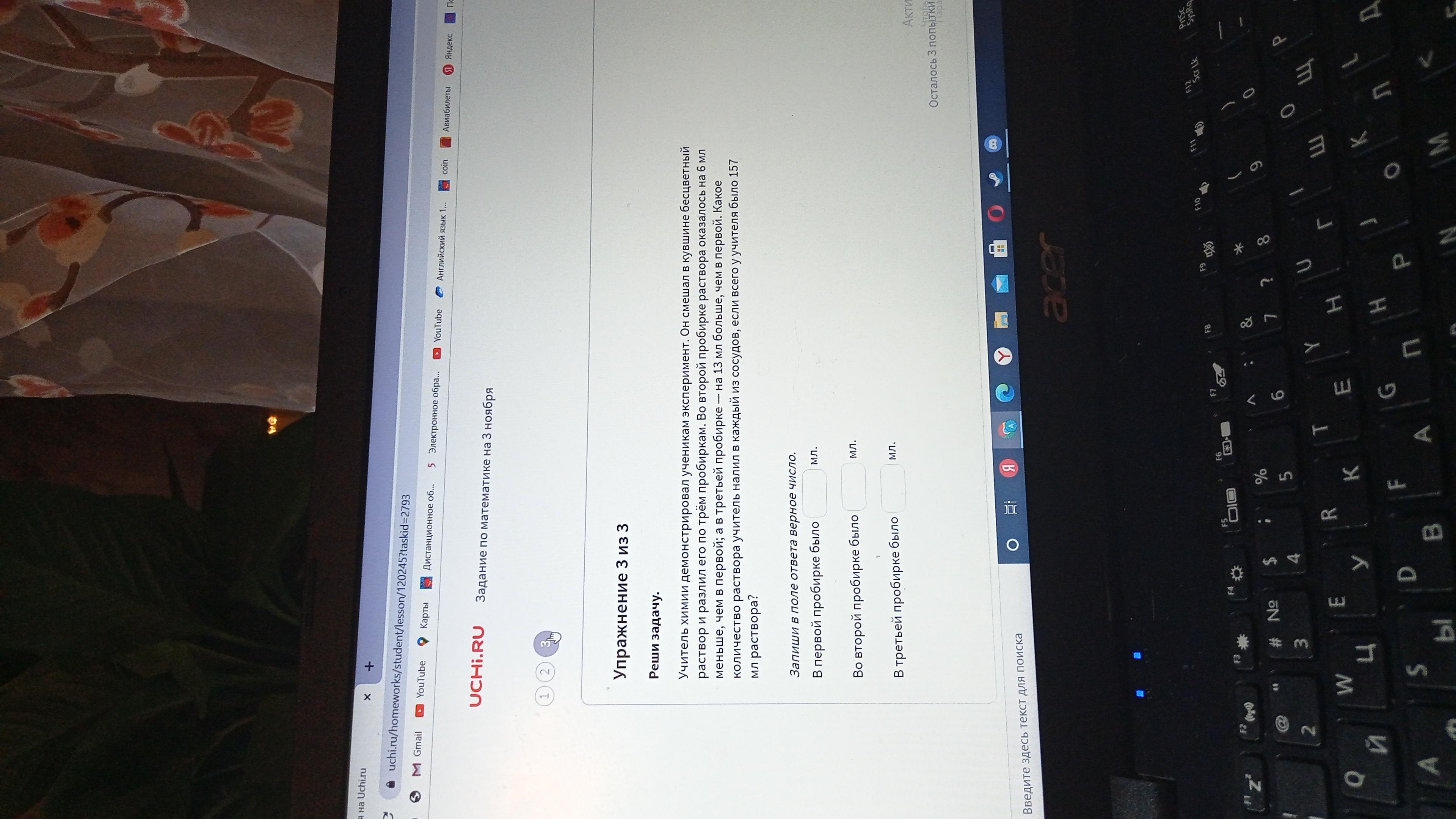 Ответ: В 1 пробирке 50 мл, во 2 пробирке 44 м, в 3 пробирке - 63 мл.