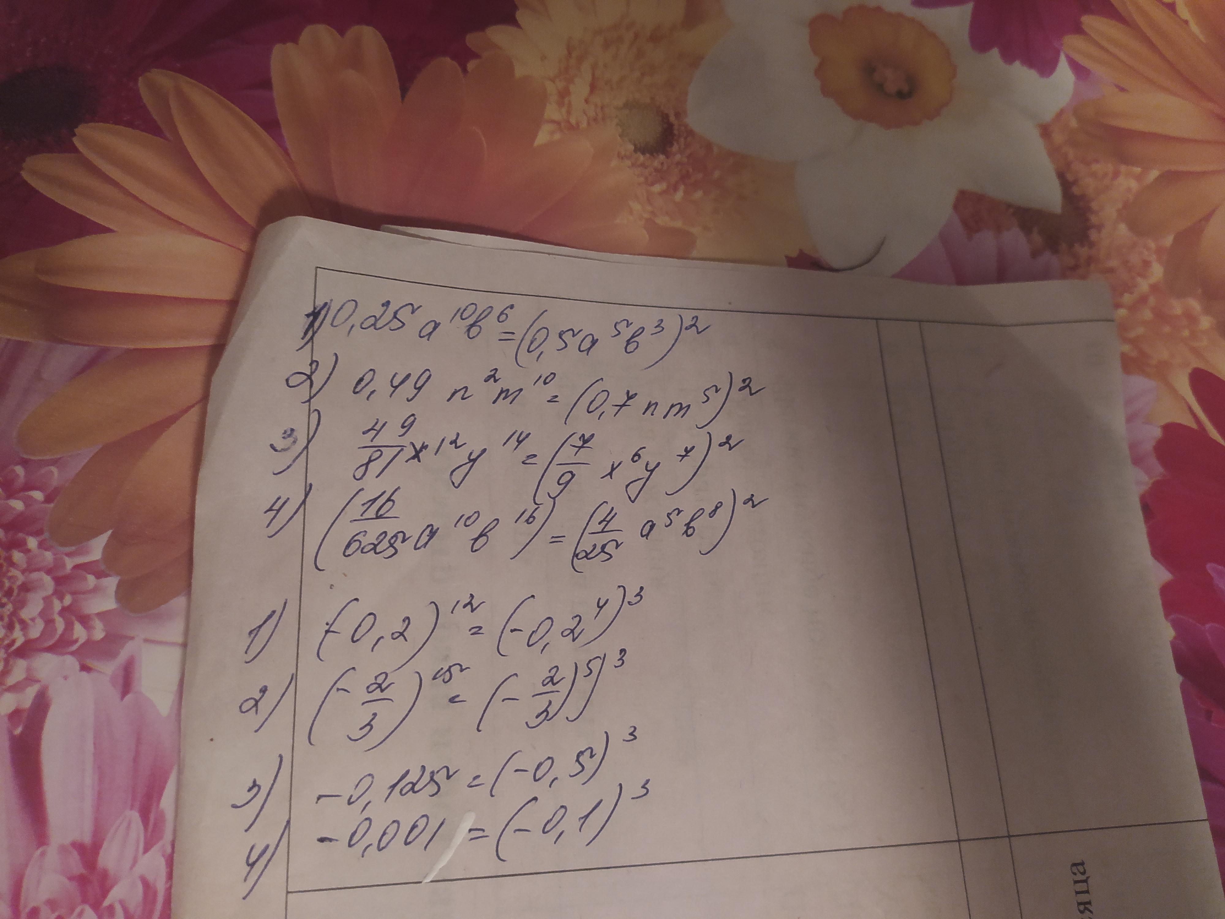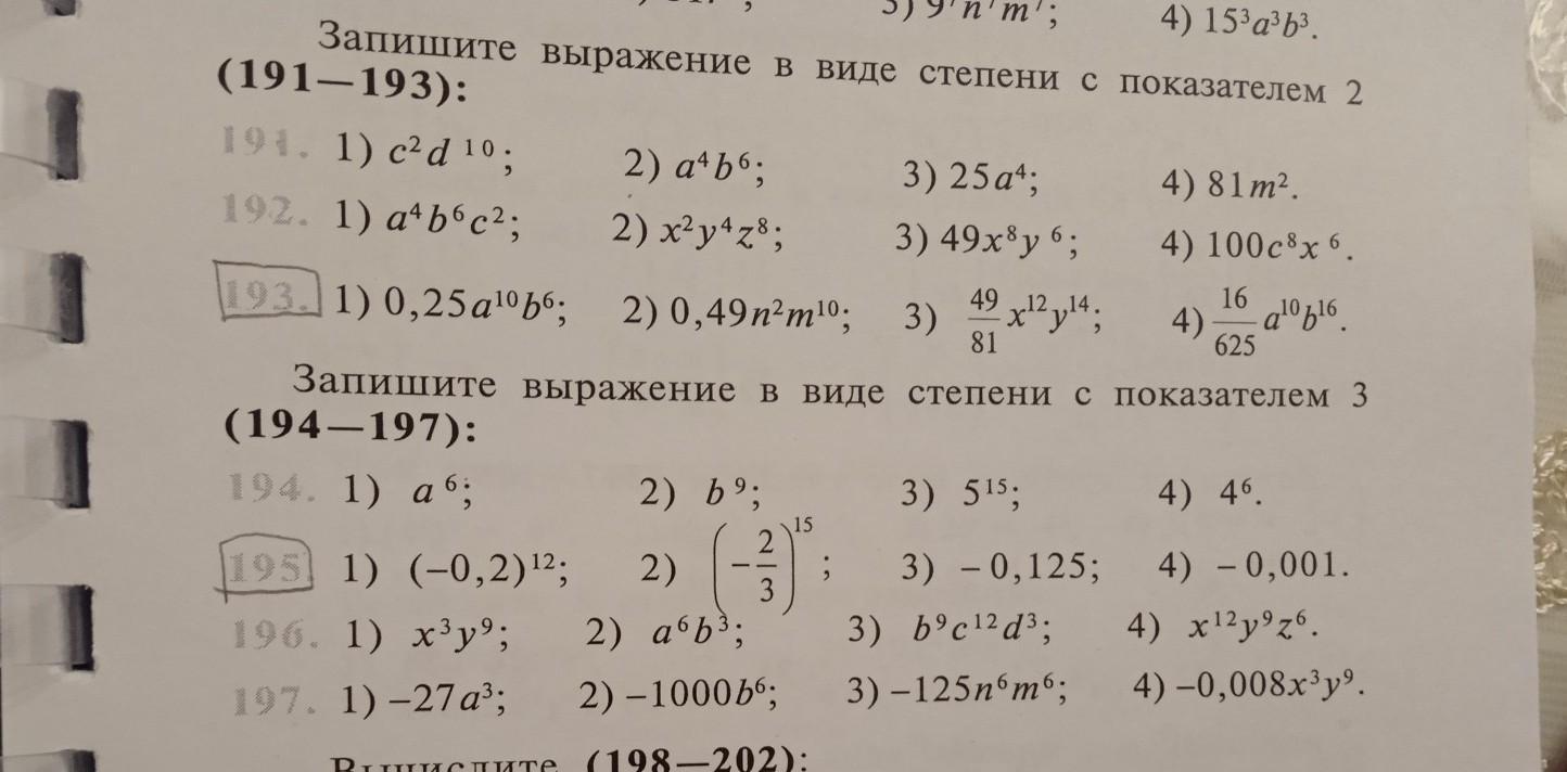 запишите выражение в виде степени с показателем 2 3) 49/81x¹²y¹⁴ 4)16/625a¹⁰b¹⁶. те которые карандашом отметила сделайте и 194 тоже