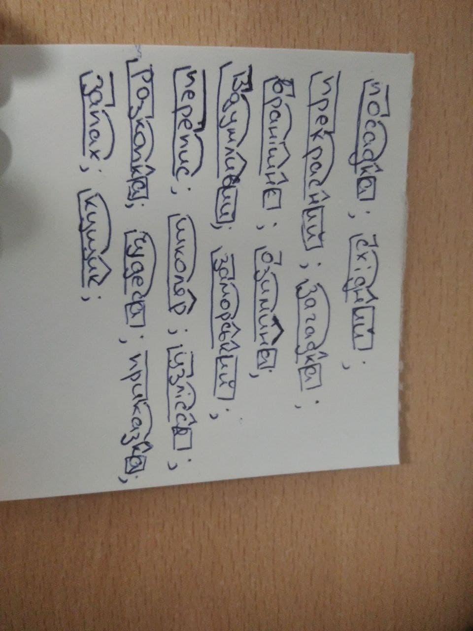 Будова слів:посадка,східний,прекрасний,загадка,вранішнє,озимина,вдумливий,замормький,перепис, школяр, узлісся,розкопка,чудеса,приказка, запах,кущик