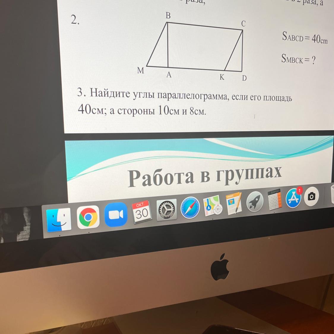 3)АВ=S/BC=40:10=4. В треугольнике гипотенуза МВ в 2 раза больше катета АВ,т е один угол равен 30 градусов. Другой 180-30=150