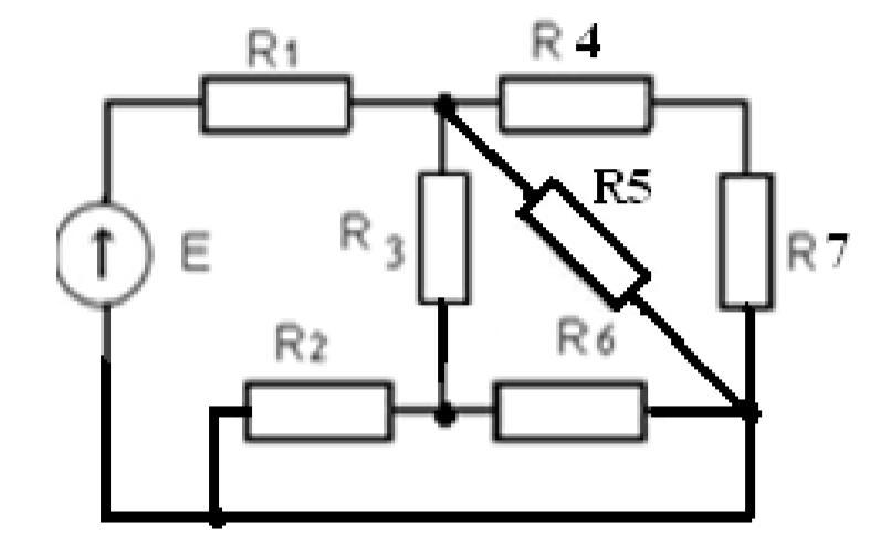 R2= R6=4 Ом, R3=2 Ом, R4=5 Ом, R5=8 Ом, R7=3Ом,