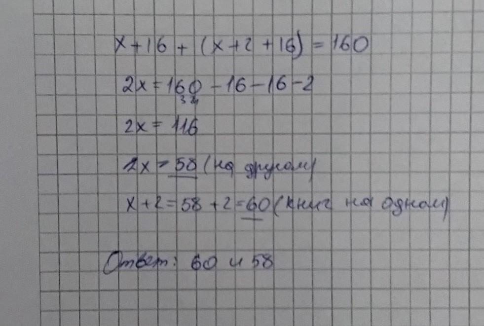 в школьной библиотеке на одной стеллажи книг 2 больше чем на другом затем на каждой стеллаж добавили по 16 книг Сколько первоначально было книг на каждом стеллажи если их стало всего 160