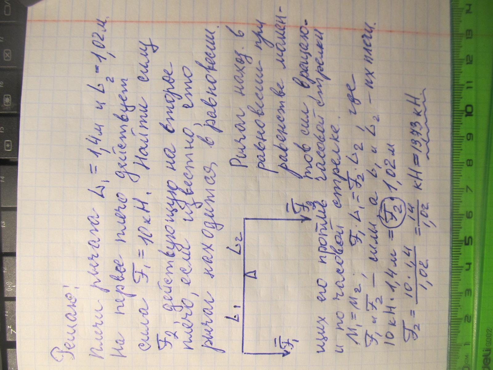 Найти величину силы Р2 из условия равновесия рычага, если Р1=10 кН, Д1=1,4 м, Д2=1,02 м.