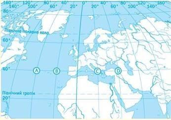 У якому з позначених буквами пунктів на фрагменті карти Північної півкулі (мал. 37) Сонце буде перебувати найвище над горизонтом об 11.00 год часу Гринвіцького меридіана? Відповідь обґрунтуйте.
