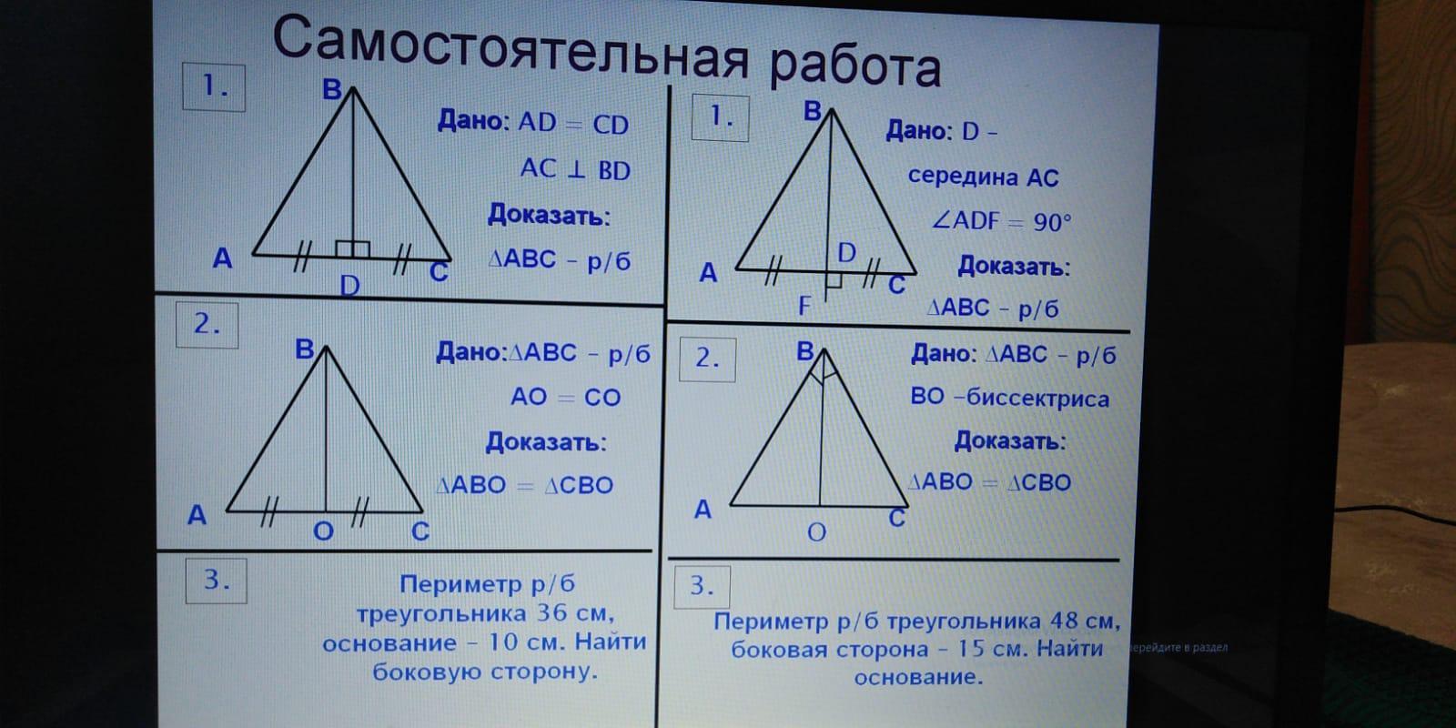 2(левый). Т.к ΔABC равнобедренный, то медиана(BO), проведенная к основанию треугольника является одновременно его биссектрисой и высотой. ⇒ ∠AOB = ∠COB = 90°. По второму признаку равенства треугольников(сторона и два прилежащих угла) ΔABO=ΔCBO (AO=OC по условию, ∠BAC=∠BCO, т.к ABC р/б, ∠AOB = ∠COB(доказали выше)).