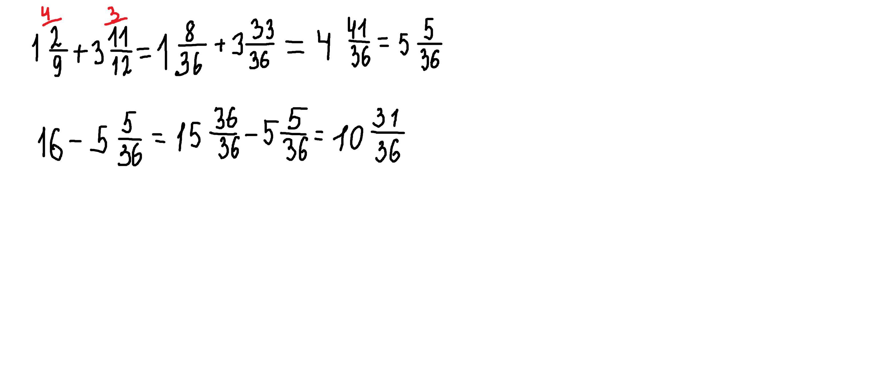 16 - (1 2/9 + 3 11/12) = 16 - (11/9 + 47/12) = 16- (44/36 + 141/36)=