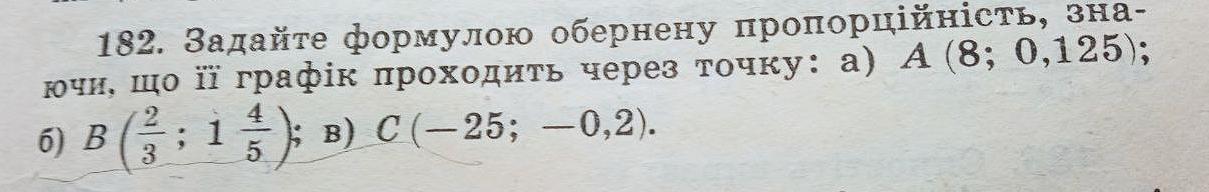 Задайте формулой обратную пропорциональность, зная, что ее график проходит через точку: а) A(8; 0,125); б) B (2/3; 1 4/5); в) C (-25; -0,2)