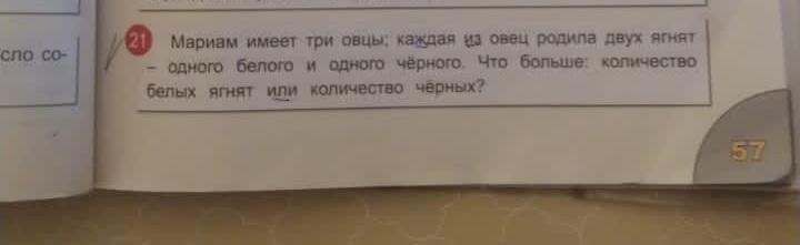Я не очень понял, поподробнее можно? Если три овцы родили по 2 ягненка и 1 белая а другая черная, то тут не состыковка