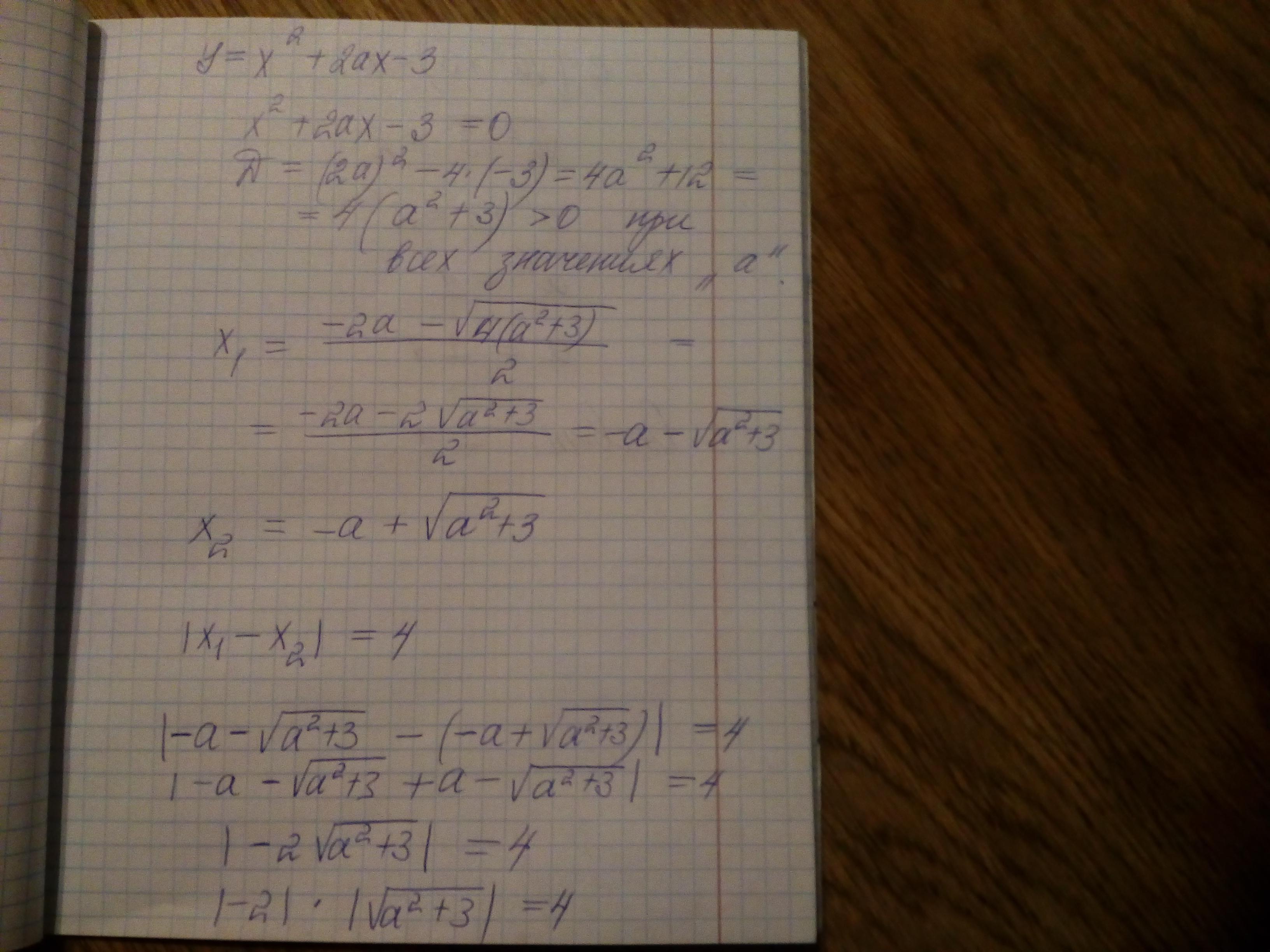 При каких значениях параметра a расстояние между нулями функции y=x^2+2ax-3 равно 4?