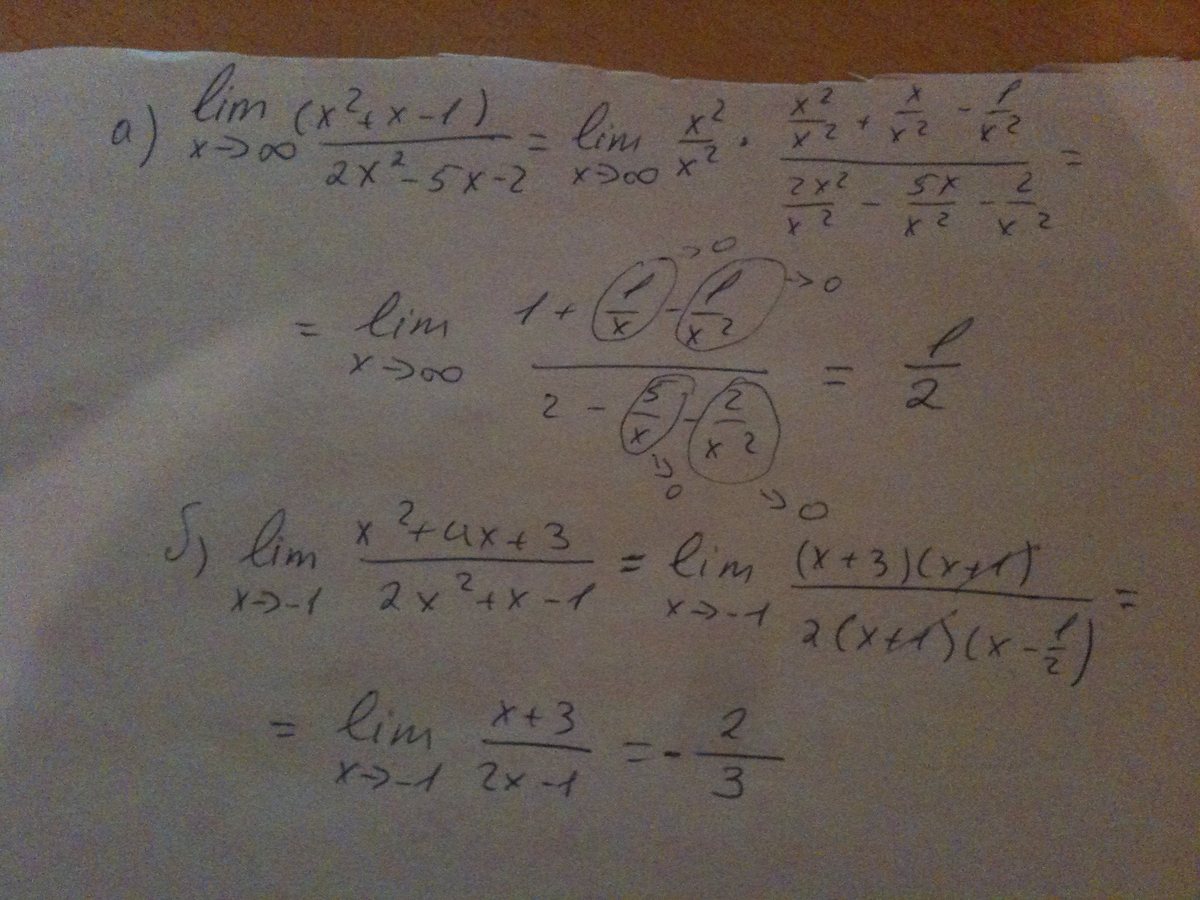 3. Вычислить пределы: а) lim=(x^2+x-1)/(2x^2-5x-2) x стремится к бесконечности ; б) lim=(x^2+4x+3)/(2x^2+x-1) x стремится к -1