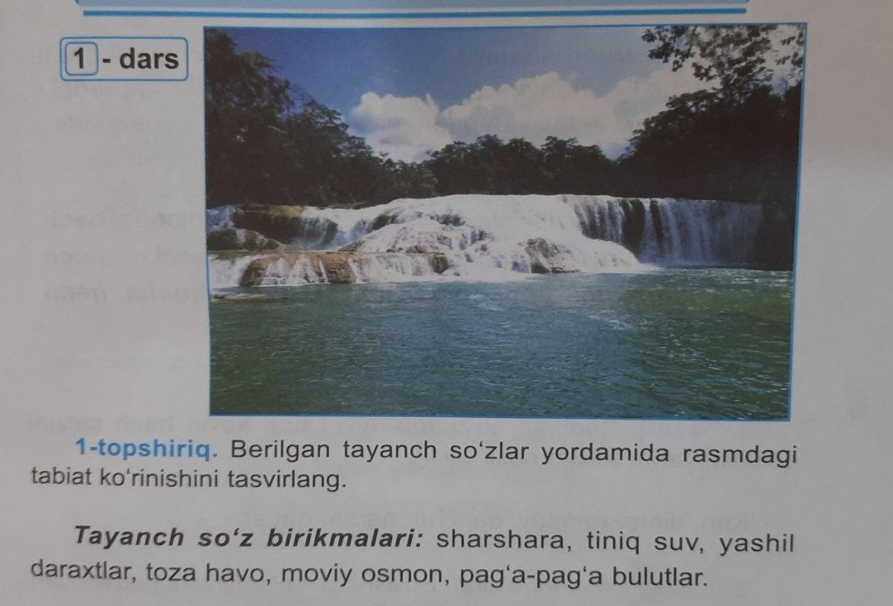 Bu rasmda chiroyli manzarani ko'rishimiz mumkin. Chunki bu rasmda tabiat tasvirlangan, ya'ni sharshara, yam-yashil daraxtlar va moviy osmon. Sharsharadan tiniq suvlar oqmoqda. Osmon bo'lsa pag'a-pag'a bulutlarga to'la.