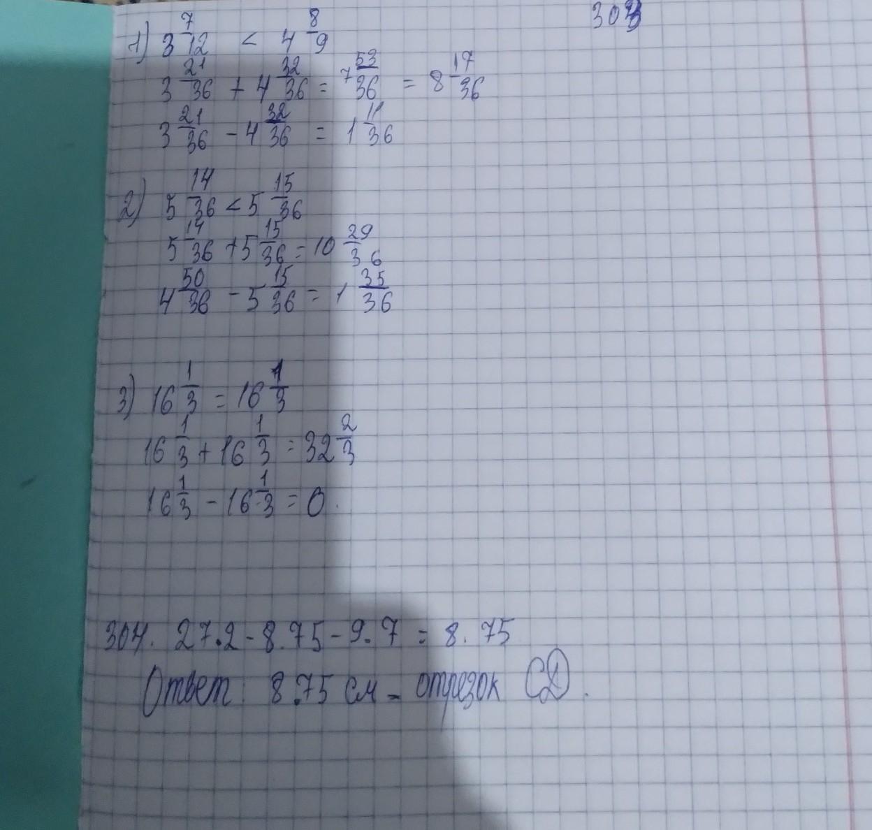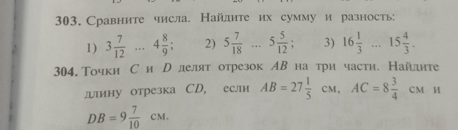 5 1) 3 2) 5 5...5; 3) 16 ... 15 , 303. Сравните числа. Найдите их сумму и разность: 7 8 7 1 12 45; 9 18 12 3 3 304. Точки С и Dделят отрезок АВ на три части. Найдите 3 длину отрезка CD, AB = 27 см, AC = 8 см и 5 7 DB = 9 10 если , . 4 СМ.