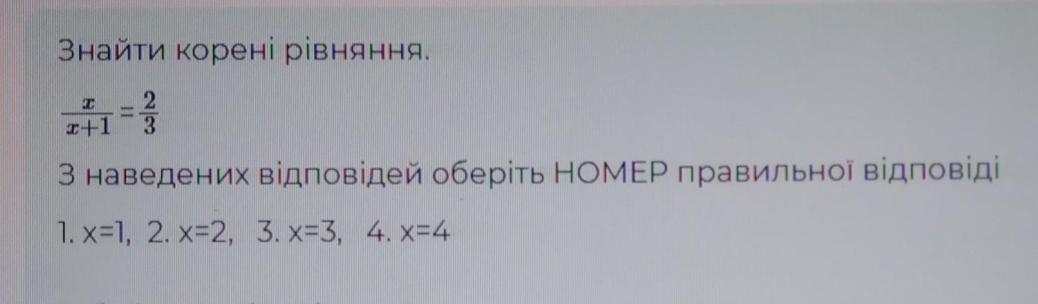 ДАМ 50 БАЛЛОВ!! Знайти корені рівняння. х/х+1= 2/3 наведених відповідей оберіть HOMEP правильної відповіді 1. x=1, 2, x=2, 3, х=3, 4. х=4