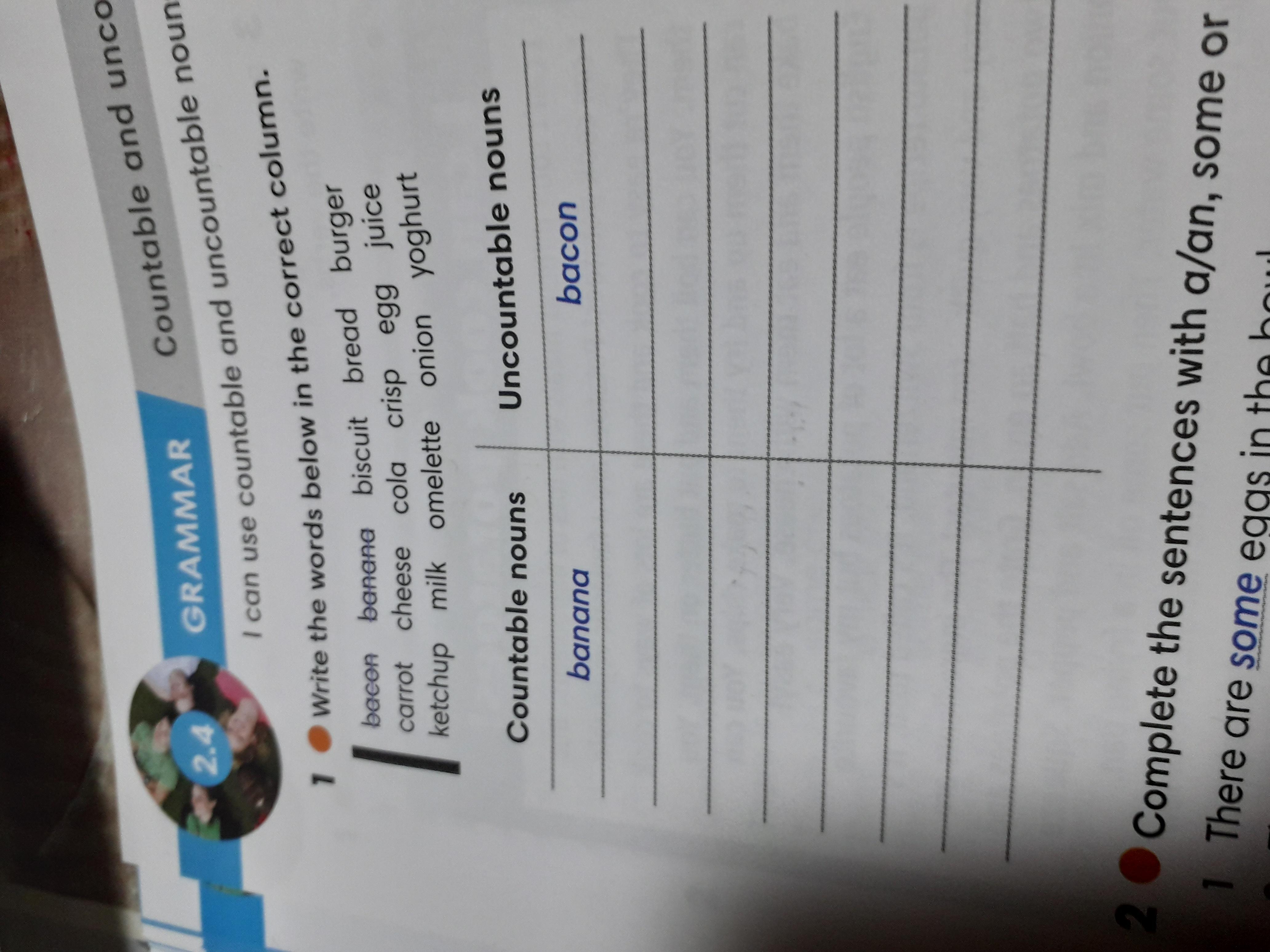 Uncountable: bread, cheese, cola, crisp, juice, ketchup, milk, omelette, yoghurt