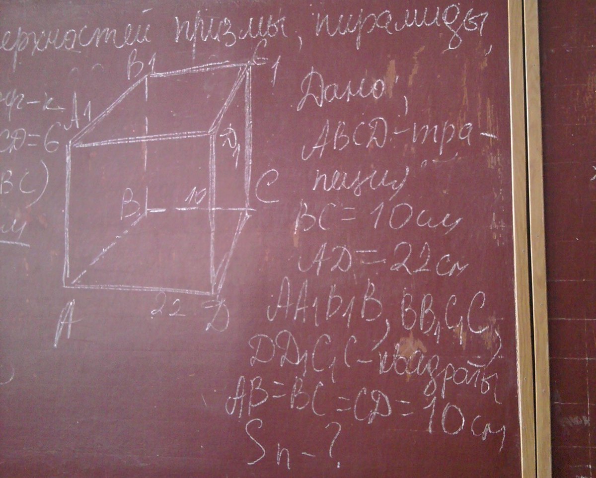 Найти площадь призмы. ABCD и A₁B₁C₁D₁ — равные трапеции, BC=10 см, AD=22 см. Боковые стороны — квадраты со стороной 10 см.