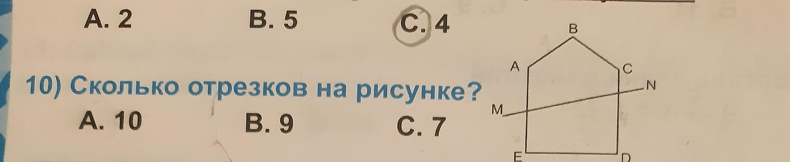 Назовём точки пересечения прямой MN отрезков CD и АЕ, пусть точка пересечения МN СD называется K, а точка пересечения MN AE называется L, тогда всего можно найти 10 отрезков - АВ, ВС, CD, DE, AE, АL, El, CK, DK и LK
