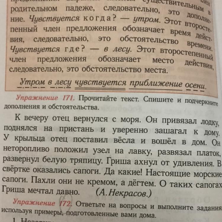 5.Что вы знаете об определении, дополнении обстоятельстве?Определение, дополнение, обстоятельство — это второстепенные члены предложения.Дополнение обозначает предмет и отвечает на вопросы падежов,определение обозначает признак предмета и отвечает на вопросы какой? какая?, обстоятельство обозначает место, время, и способ действия и отвечает на вопросы где? когда?