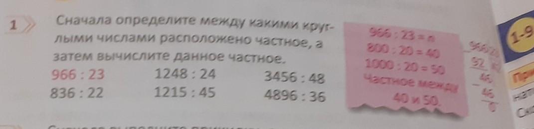 Сначала определите между какими круг- лыми числами расположено частное, а затем вычислите данное частное. 966:23 1248:24 3456:48 836:22 1215:45 4896:36 966: 23 = n 800:20 = 40 1000:20 = 50 Частное между 40 и 50. 9662 92 42 45 46 0