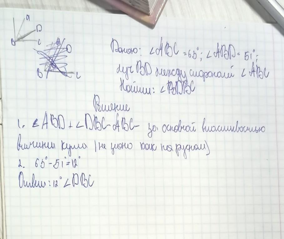 Луч BD проходит между сторонами углами ABC. Найти угол DBC, если угол ABC=63°, а угол ABD=51° помогите пожалуйста