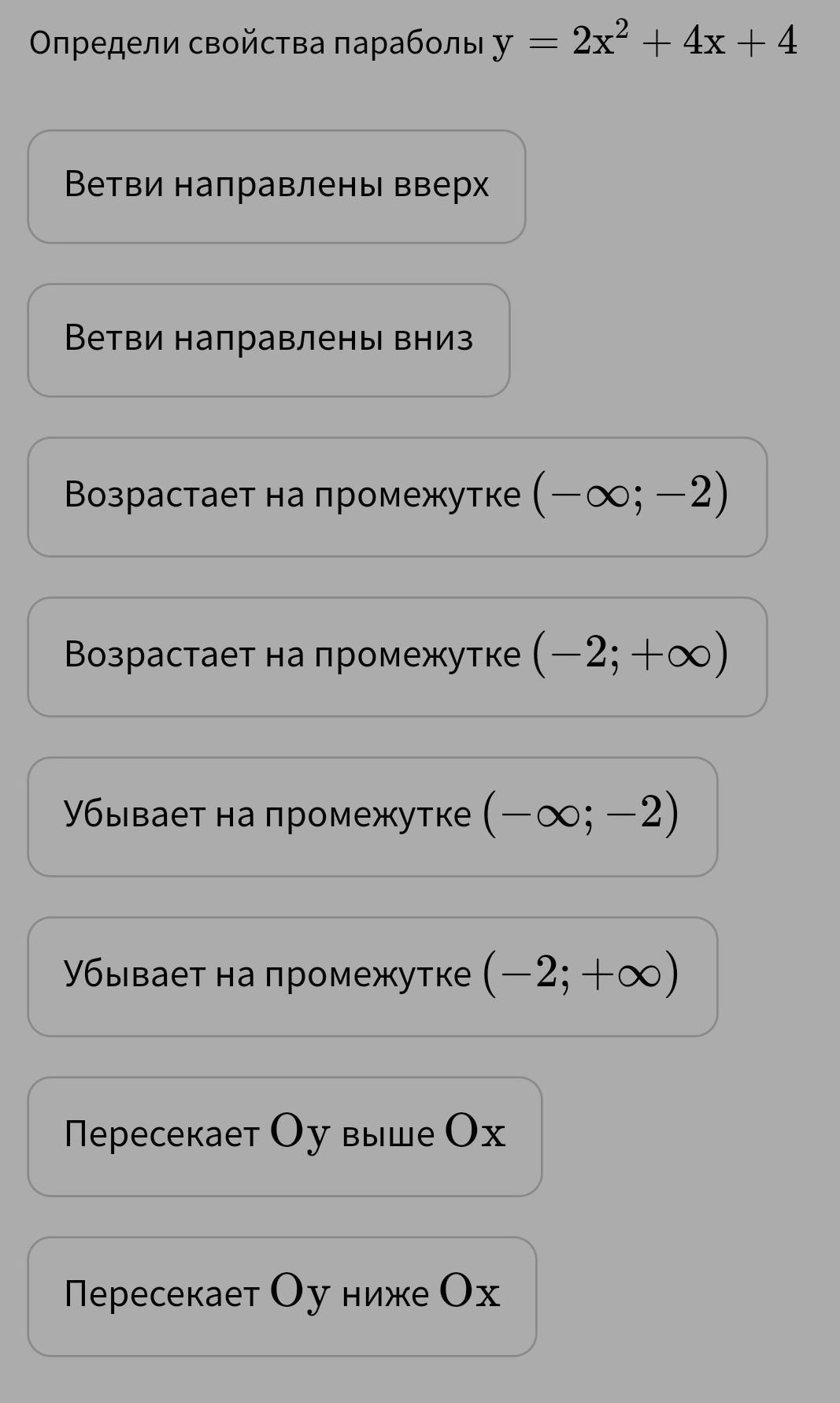 Ответ: Ветви направлены вверх; Убывает на промежутке (-∞;-2); Пересекает OY выше OX