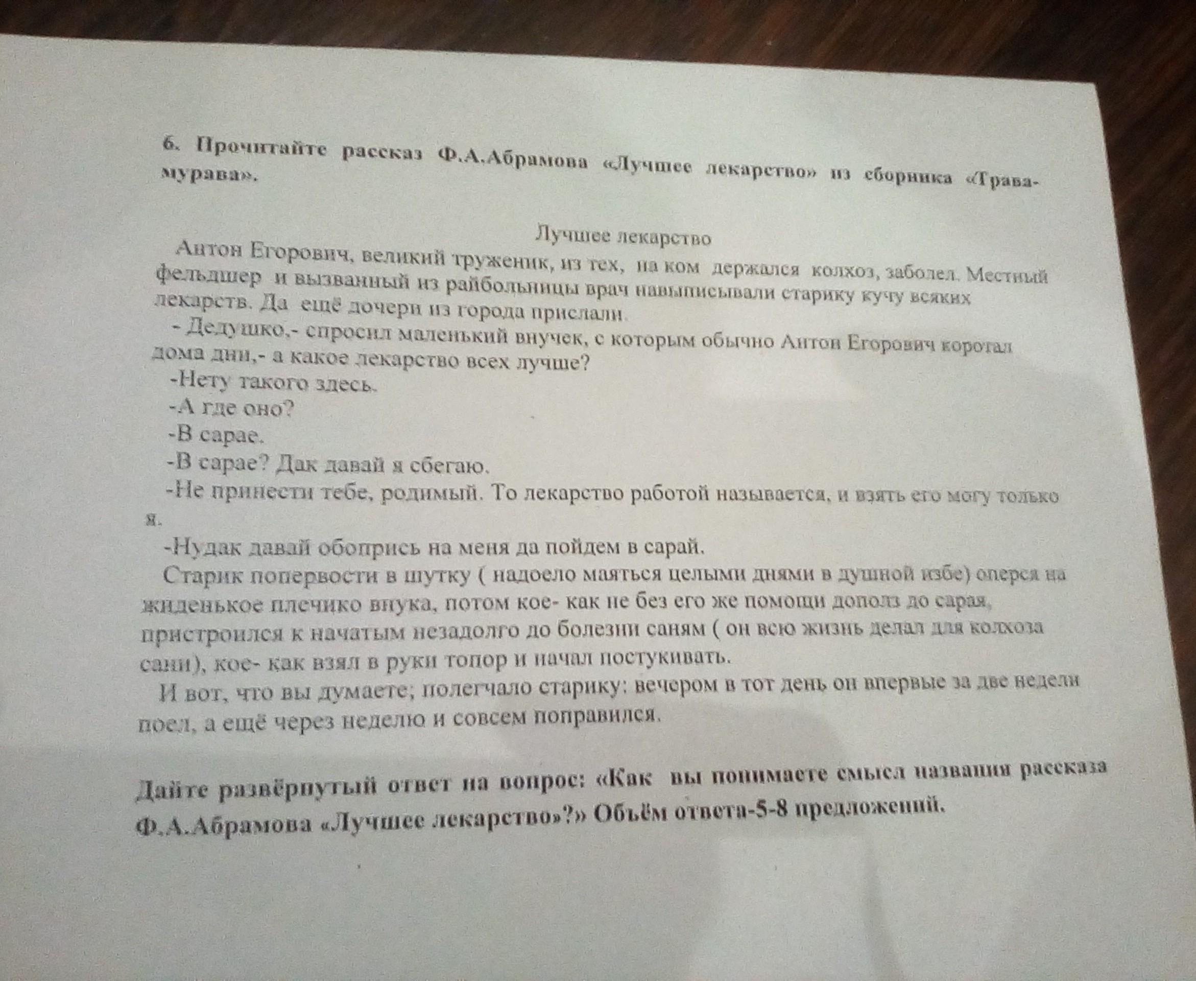 дайте развёрнутый ответ на вопрос "Как вы понимаете смысл названия рассказа Ф. А. Абрамова "Лучшее лекарство"?" объём ответа 5-8 предложений