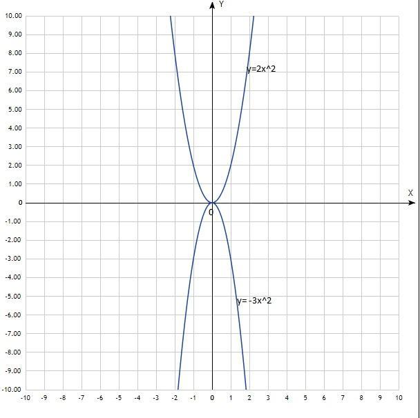 Уравнение квадратичной функции, график - парабола, ветви направлены: а) вверх; б) вниз, вершины парабол в начале координат (0; 0)