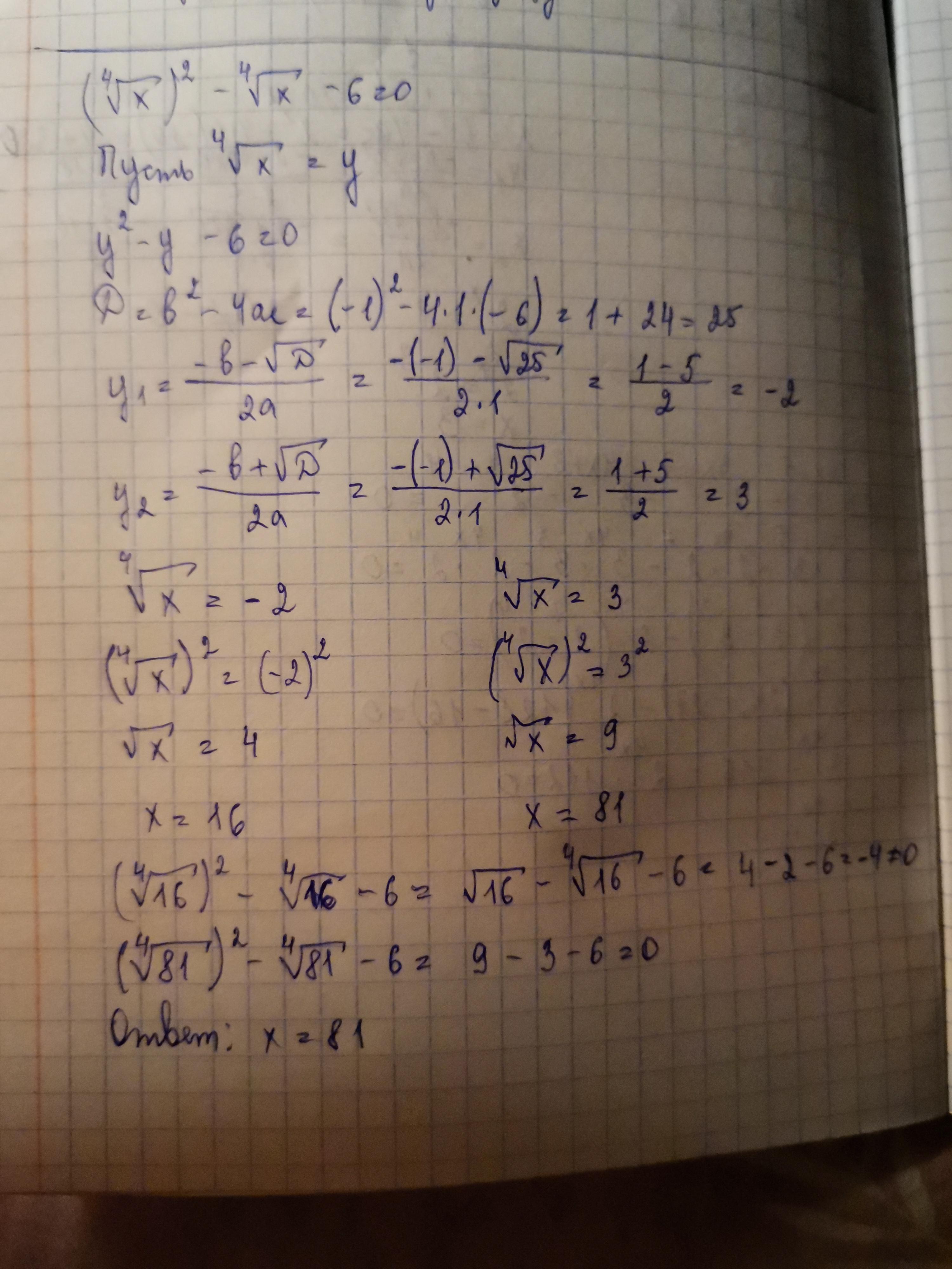 4 корень из 81^2 - 4 корень из 81 - 6=0
